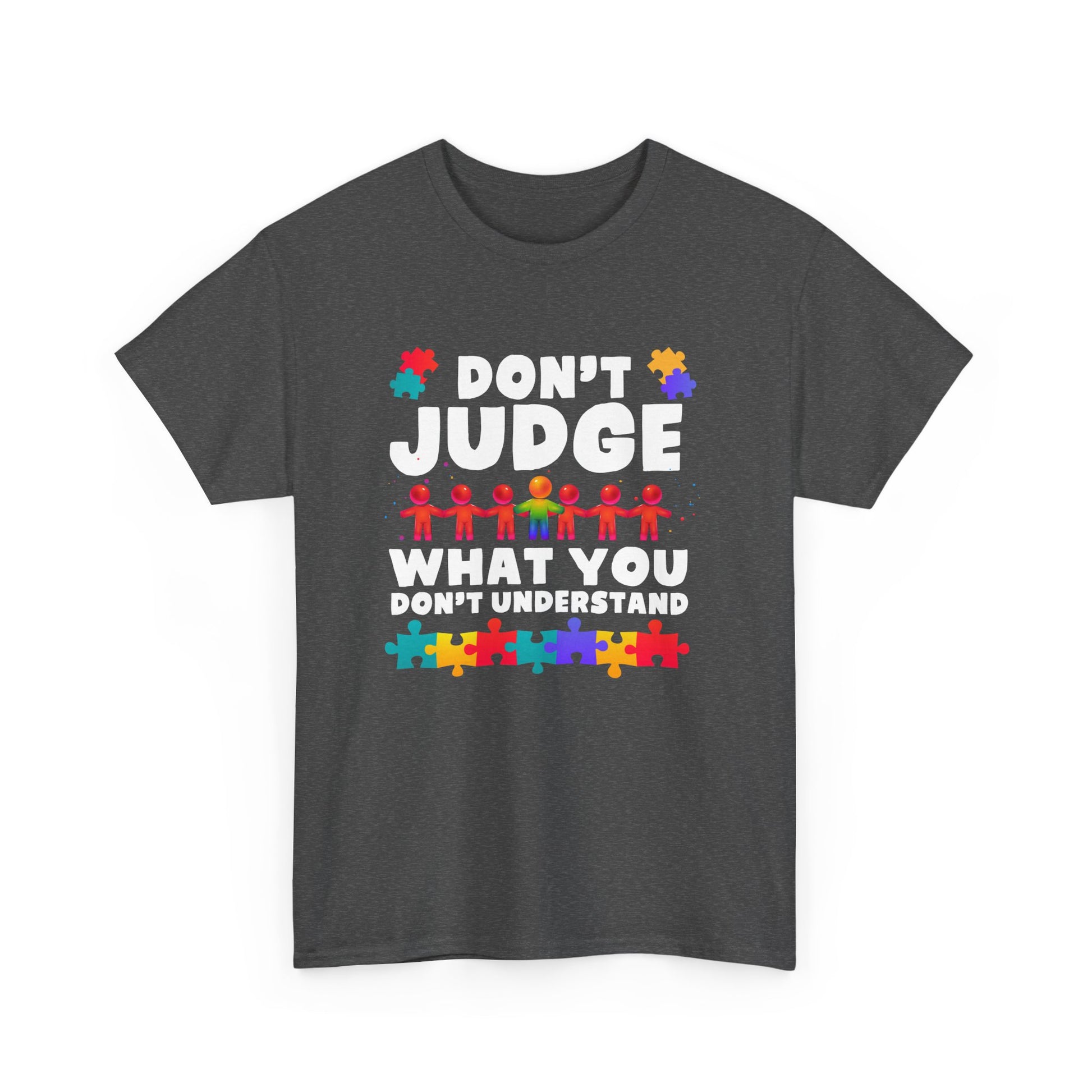 Don't Judge What You Don't Understand. World autism awareness day designed to support the cause and efforts behind autism awareness. Autism Awareness and Autistic Acceptance design as well as down syndrome awareness design. Great design for Autism Brother, Autism Sister, autistic brother, and autistic sister. This Autism Awareness - Autism Mom Dad - Autism Love Don't Judge item is designed by Autism Awareness Designs by Fasaza. The unisex heavy cotton tee is the basic staple of any wardrobe. It is the foundation upon which casual fashion grows. All it needs is a personalized design to elevate things to profitability. The specially spun fibers provide a smooth surface for premium printing vividity and sharpness. No side seams mean there are no itchy interruptions under the arms. The shoulders have tape for improved durability. .: Made with medium fabric (5.3 oz/yd² (180 g/m²)) consisting of 100% cotton for year-round comfort that is sustainable and highly durable. .: The classic fit of this shirt ensures a comfy, relaxed wear while the crew neckline adds that neat, timeless look that can blend into any occasion, casual or semi-formal. .: The tear-away label means a scratch-free experience with no irritation or discomfort whatsoever. .: Made using 100% US cotton that is ethically grown and harvested. Gildan is also a proud member of the US Cotton Trust Protocol ensuring ethical and sustainable means of production. This blank tee is certified by Oeko-Tex for safety and quality assurance. EU representative: HONSON VENTURES LIMITED, gpsr@honsonventures.com, 3, Gnaftis House flat 102, Limassol, Mesa Geitonia, 4003, CY Product information: Gildan 5000, 2 year warranty in EU and Northern Ireland as per Directive 1999/44/EC Warnings, Hazard: For adults, Made in Nicaragua Care instructions: Machine wash: warm (max 40C or 105F), Non-chlorine: bleach as needed, Tumble dry: medium, Do not iron, Do not dryclean