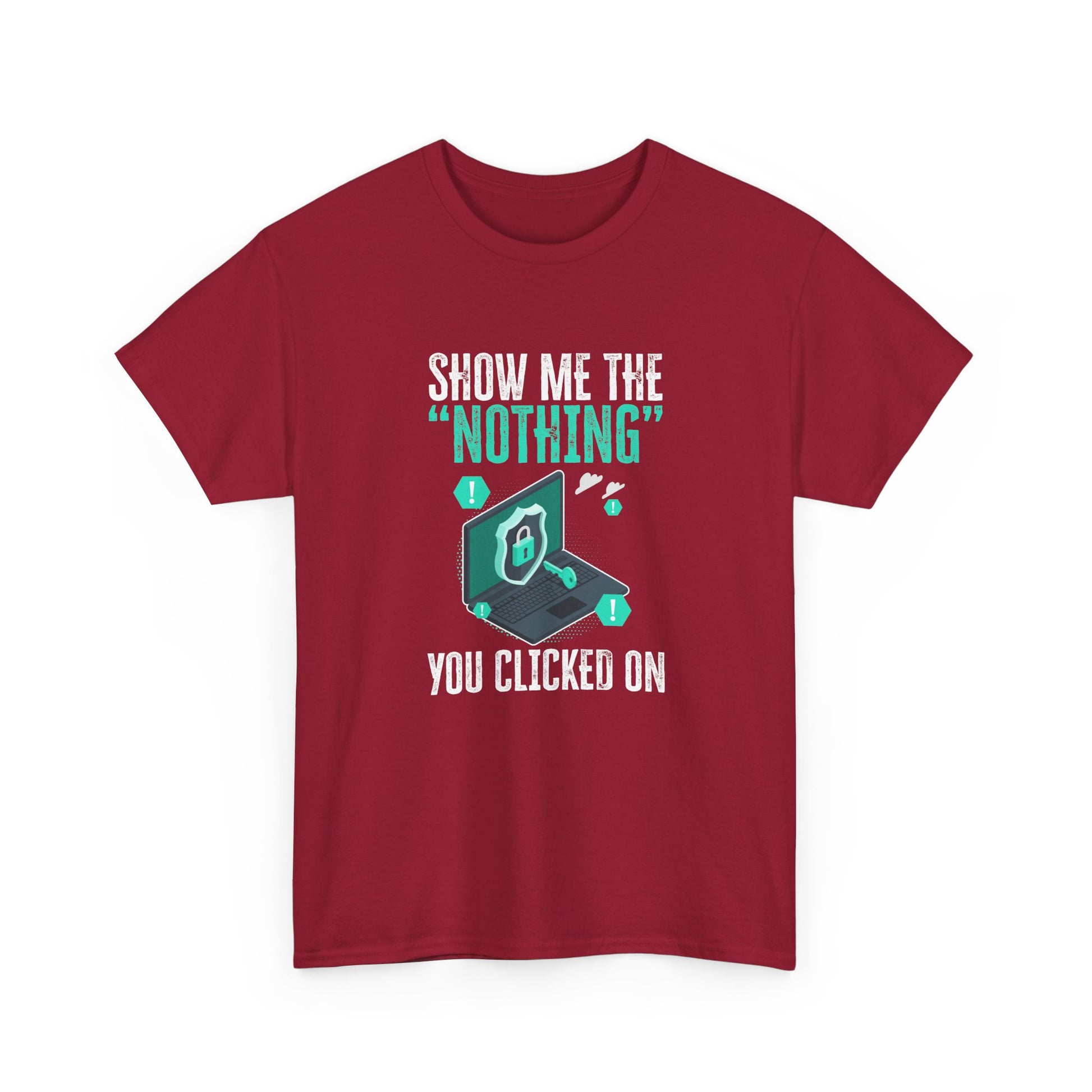 Funny Cool Cybersecurity Network Engineer Analyst design celebrates the expertise and role of individuals who specialize in the field of cybersecurity and data protection. For cybersecurity professionals, IT Security, IT Support, and network engineers. Funny IT Security design saying "Show me the "Nothing" you click on". This Funny Cybersecurity IT Support IT Security Network Engineer item is designed by Cybersecurity Designs by Fasaza. The unisex heavy cotton tee is the basic staple of any wardrobe. It is the foundation upon which casual fashion grows. All it needs is a personalized design to elevate things to profitability. The specially spun fibers provide a smooth surface for premium printing vividity and sharpness. No side seams mean there are no itchy interruptions under the arms. The shoulders have tape for improved durability. .: Made with medium fabric (5.3 oz/yd² (180 g/m²)) consisting of 100% cotton for year-round comfort that is sustainable and highly durable. .: The classic fit of this shirt ensures a comfy, relaxed wear while the crew neckline adds that neat, timeless look that can blend into any occasion, casual or semi-formal. .: The tear-away label means a scratch-free experience with no irritation or discomfort whatsoever. .: Made using 100% US cotton that is ethically grown and harvested. Gildan is also a proud member of the US Cotton Trust Protocol ensuring ethical and sustainable means of production. This blank tee is certified by Oeko-Tex for safety and quality assurance. EU representative: HONSON VENTURES LIMITED, gpsr@honsonventures.com, 3, Gnaftis House flat 102, Limassol, Mesa Geitonia, 4003, CY Product information: Gildan 5000, 2 year warranty in EU and Northern Ireland as per Directive 1999/44/EC Warnings, Hazard: For adults, Made in Nicaragua Care instructions: Machine wash: warm (max 40C or 105F), Non-chlorine: bleach as needed, Tumble dry: medium, Do not iron, Do not dryclean