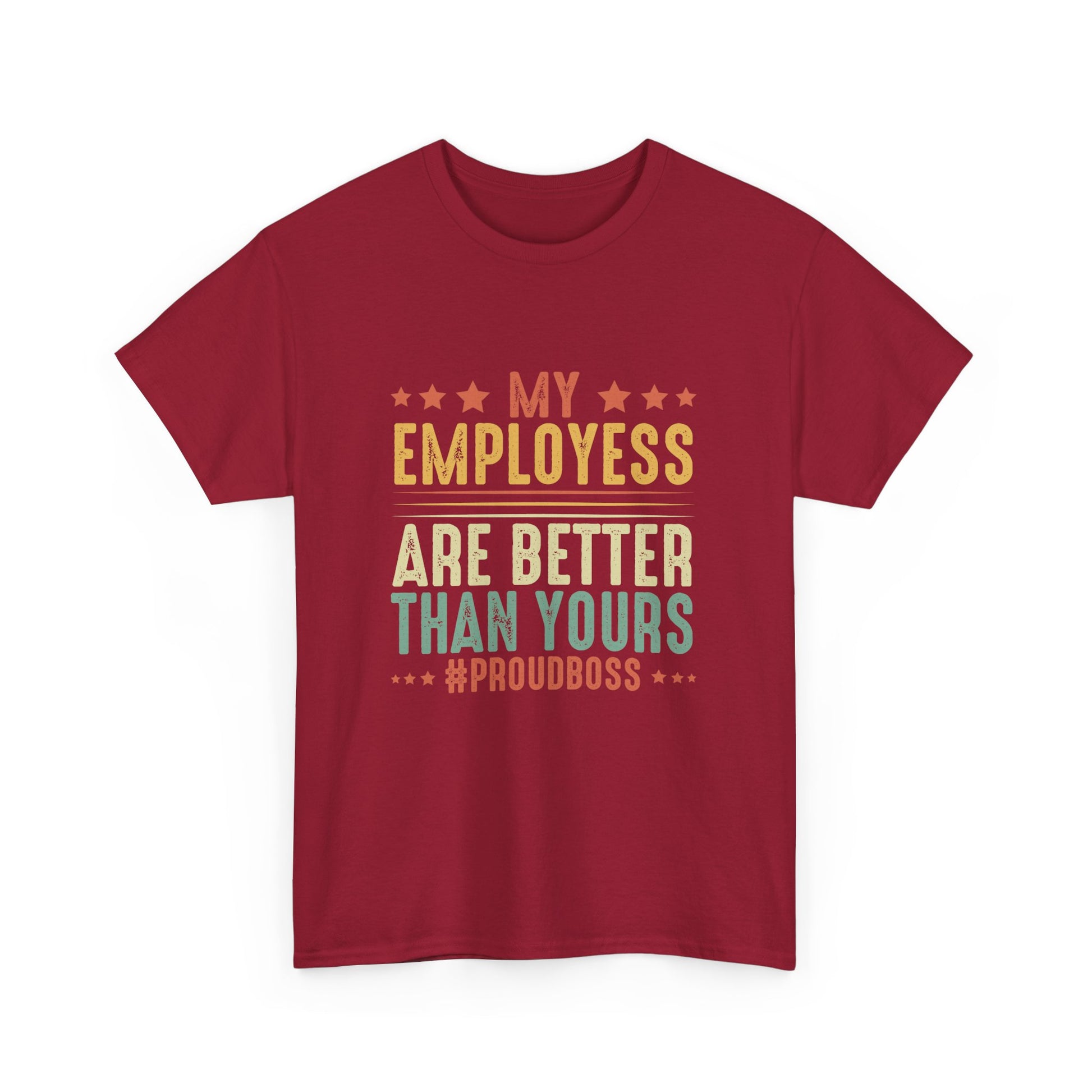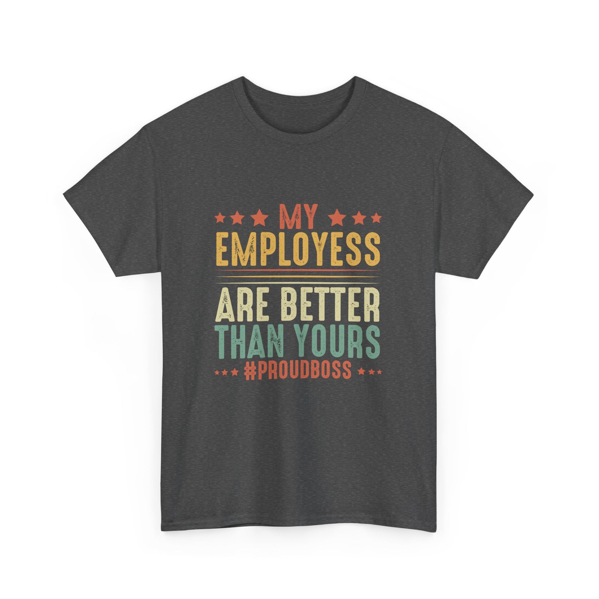My employees are better than yours. If your employees are the best ever, then you can express your gratitude towards them with this design. Thank your employees for everything they have given you in your professional life. This Proud Boss Employee Appreciation Boss Manager CEO Men Women item is designed by Employee Appreciation Designs by Fasaza. The unisex heavy cotton tee is the basic staple of any wardrobe. It is the foundation upon which casual fashion grows. All it needs is a personalized design to elevate things to profitability. The specially spun fibers provide a smooth surface for premium printing vividity and sharpness. No side seams mean there are no itchy interruptions under the arms. The shoulders have tape for improved durability. .: Made with medium fabric (5.3 oz/yd² (180 g/m²)) consisting of 100% cotton for year-round comfort that is sustainable and highly durable. .: The classic fit of this shirt ensures a comfy, relaxed wear while the crew neckline adds that neat, timeless look that can blend into any occasion, casual or semi-formal. .: The tear-away label means a scratch-free experience with no irritation or discomfort whatsoever. .: Made using 100% US cotton that is ethically grown and harvested. Gildan is also a proud member of the US Cotton Trust Protocol ensuring ethical and sustainable means of production. This blank tee is certified by Oeko-Tex for safety and quality assurance. EU representative: HONSON VENTURES LIMITED, gpsr@honsonventures.com, 3, Gnaftis House flat 102, Limassol, Mesa Geitonia, 4003, CY Product information: Gildan 5000, 2 year warranty in EU and Northern Ireland as per Directive 1999/44/EC Warnings, Hazard: For adults, Made in Nicaragua Care instructions: Machine wash: warm (max 40C or 105F), Non-chlorine: bleach as needed, Tumble dry: medium, Do not iron, Do not dryclean